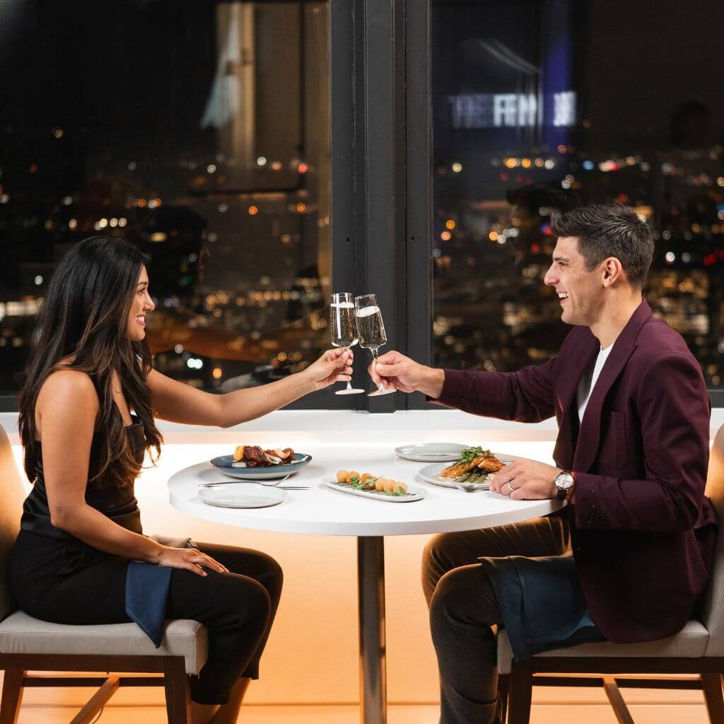 The setting marries sleek, modern interior design with large panoramic windows, setting the stage for sunsets that feel more like cinematic events. At night, city lights take center stage, turning every dinner into a celebration.