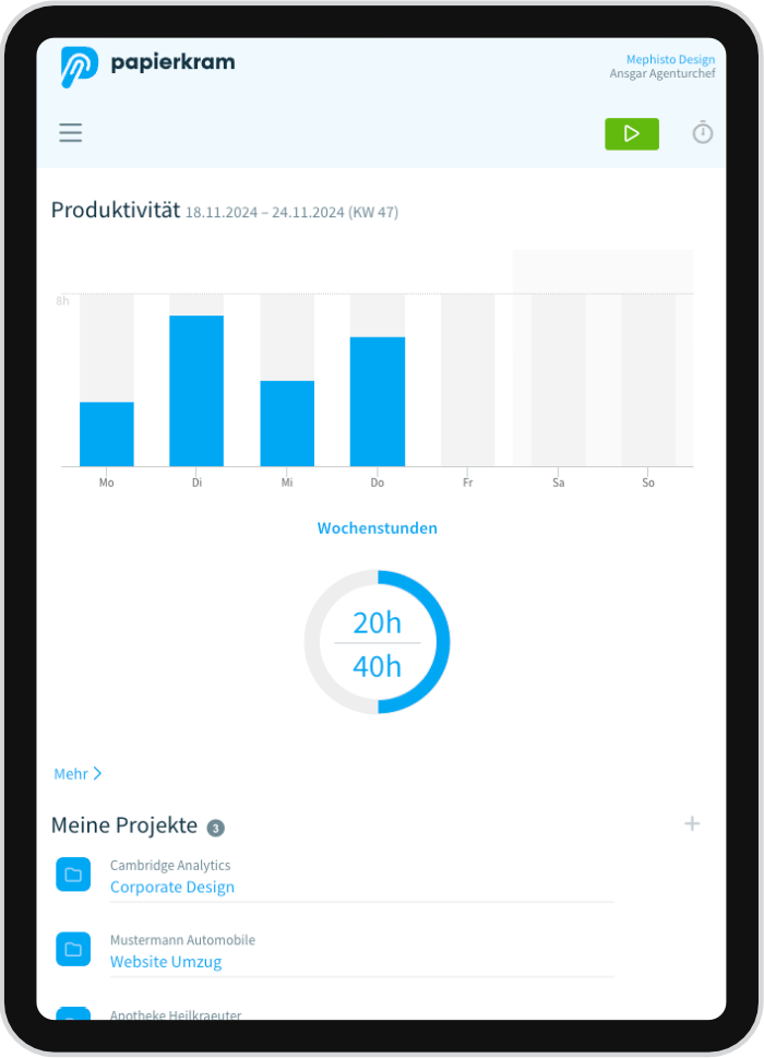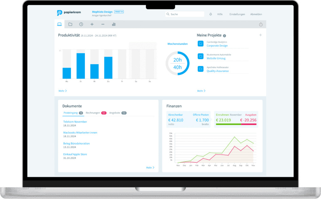 Egal ob du als Freelancer arbeitest oder ein wachsendes Team führst – Papierkram.de bietet dir genau die Funktionen, die du brauchst, ohne dich mit unnötigen Extras zu überfordern.