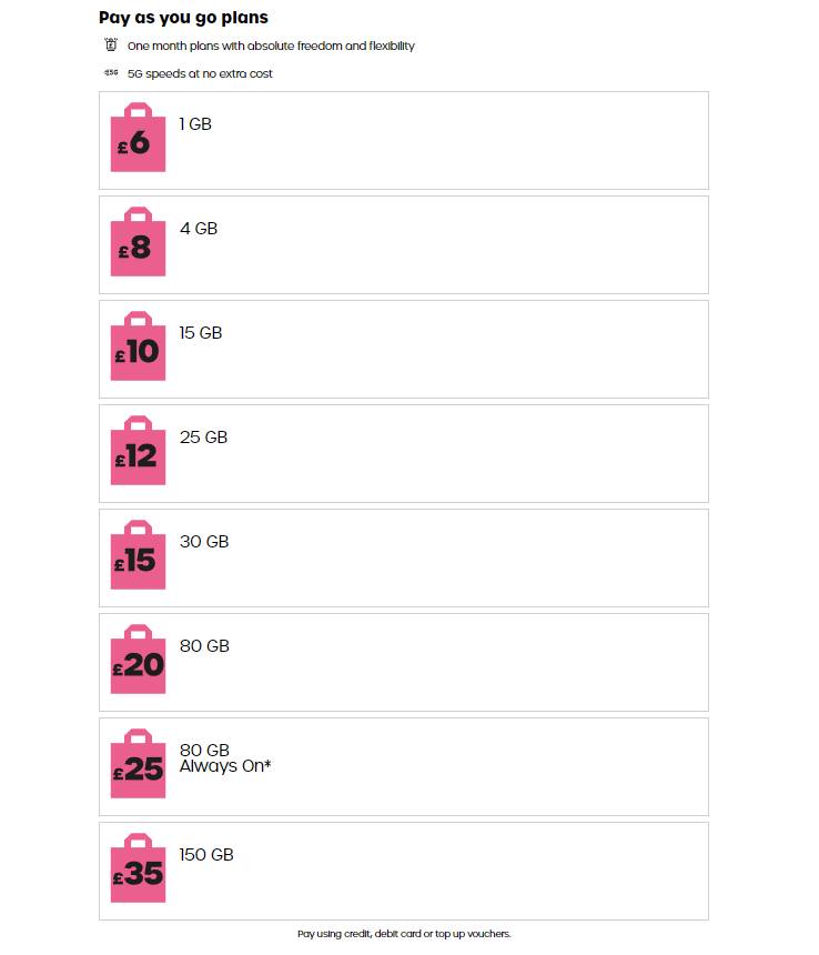 Looking for even more freedom and flexibility? GiffGaff’s pay as you go plans are the answer. With the same 5G speeds at no extra cost, you can enjoy the same connectivity advantages. Choose from their one-month plans, offering absolute freedom and flexibility to change your plan anytime. Plus, there are no credit checks, ensuring everyone can access top-notch communication services.