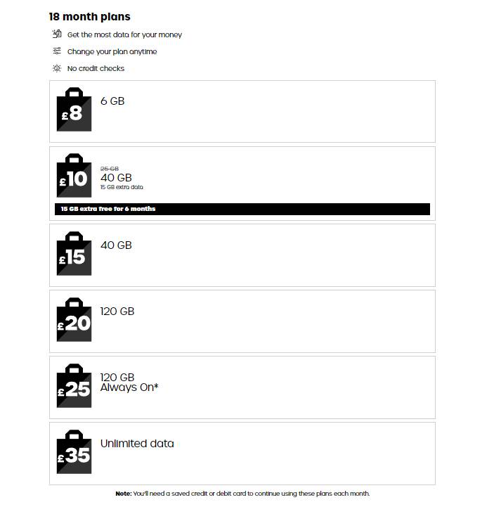 If you’re a data-hungry user, GiffGaff’s 18-month plans are tailored to give you the most data for your money. Again, you can change your plan anytime, adapting it to your evolving needs. No credit checks are required, and you can enjoy the reliability of GiffGaff’s network. This is the perfect choice for those who want a long-term commitment without compromising on flexibility.